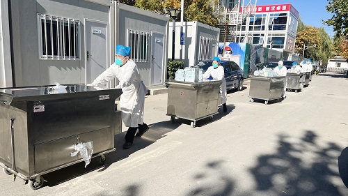 地壇醫(yī)院原餐廳目前正處于裝修階段,餐廳所有保障工作全部轉(zhuǎn)移到臨時板房中。臨時板房空間小,所有設(shè)備均是電氣設(shè)備,產(chǎn)能和效率大大降低,導(dǎo)致工作量大幅增加。而且臨時餐廳距離隔離區(qū)更遠(yuǎn),送餐到隔離區(qū)要穿過雜亂不堪的施工區(qū),花費(fèi)的時間更長。面對困難,餐廳全員齊心協(xié)力,團(tuán)結(jié)一心,克服臨時餐廳帶來的種種不便,出色完成了醫(yī)院的餐飲保障工作。